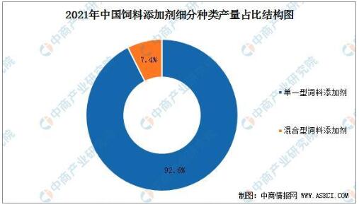 從細(xì)分品種來(lái)看,目前,我國(guó)飼料添加劑主要包括單一型飼料添加劑以及混合型飼料添加劑兩大類(lèi),其中單一型飼料添加劑是我國(guó)飼料添加劑主要應(yīng)用品種。2021年全國(guó)飼料添加劑總產(chǎn)量1477.5萬(wàn)噸,比上年增長(zhǎng)6.2%,其中,單一飼料添加劑產(chǎn)量1367.9萬(wàn)噸,增長(zhǎng)5.5%,占總添加劑產(chǎn)量的92.6%;混合型飼料添加劑產(chǎn)量109.6萬(wàn)噸,增長(zhǎng)16.2%,占總添加劑產(chǎn)量的7.4%。
