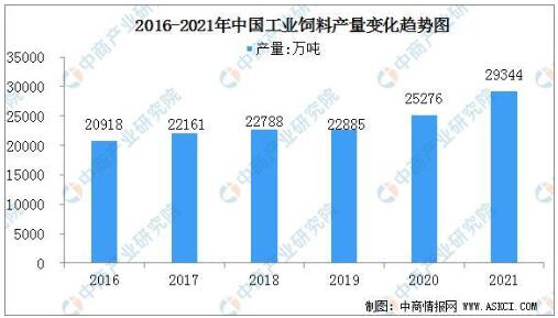 隨著我國(guó)養(yǎng)殖業(yè)的不斷發(fā)展,中國(guó)飼料工業(yè)也隨之快速崛起,國(guó)內(nèi)飼料產(chǎn)量不斷增長(zhǎng)。2016年,我國(guó)飼料產(chǎn)量為2.09億噸,同比增長(zhǎng)4.5%,到2020年,我國(guó)飼料產(chǎn)量達(dá)到2.53億噸,同比增長(zhǎng)10.4%;2021年全國(guó)工業(yè)飼料總產(chǎn)量29344萬(wàn)噸,比上年增長(zhǎng)16.1%。