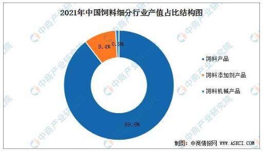 2021年中國(guó)飼料產(chǎn)品產(chǎn)值10964.0億元、營(yíng)業(yè)收入10499.8億元,分別增長(zhǎng)29.8%、29.1%,產(chǎn)值占全行業(yè)近90%;飼料添加劑產(chǎn)品產(chǎn)值1154.9億元、營(yíng)業(yè)收入1110.4億元,分別增長(zhǎng)23.8%、29.5%,產(chǎn)值占全行業(yè)的9.4%;飼料機(jī)械產(chǎn)品產(chǎn)值115.2億元,增長(zhǎng)36.4%,營(yíng)業(yè)收入77.0億元,下降3.6%。