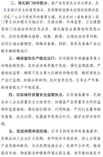 通知要求山東各地農(nóng)業(yè)農(nóng)村(畜牧獸醫(yī))部門要主動加強與當?shù)毓?、交通運輸、市場監(jiān)管、衛(wèi)生健康等部門溝通協(xié)作和信息共享,強化部門協(xié)作配合,強化畜牧業(yè)重要性的思想認識,及時協(xié)調(diào)解決堵路、封路、斷路、無理由勸返等問題,切實打通運輸梗阻,保障活畜禽、飼料、獸藥及畜禽產(chǎn)品運輸車輛順暢通行。