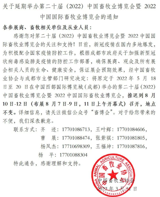 將原定于2022年5月18日至20日在中國(guó)西部國(guó)際博覽城(成都)舉辦的第二十屆(2022)中國(guó)畜牧業(yè)博覽會(huì)暨2022中國(guó)國(guó)際畜牧業(yè)博覽會(huì),推遲到8月10日-12日召開,地點(diǎn)不變。