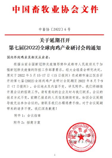 關(guān)于延期召開第七屆(2022)全球肉雞產(chǎn)業(yè)研討會的通知