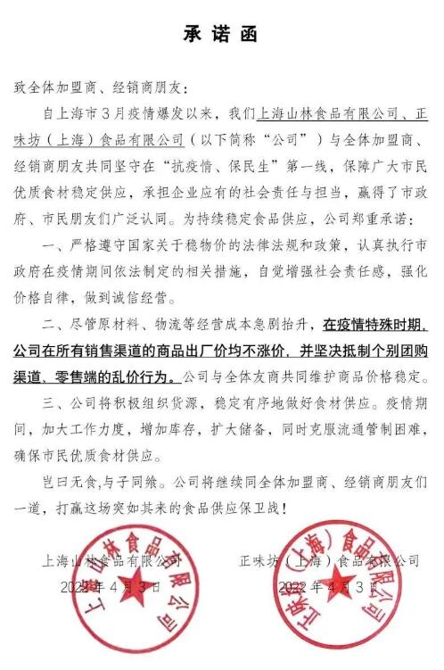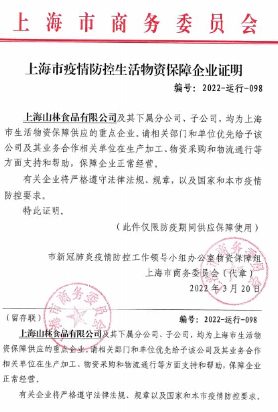 為確保供應(yīng)鏈正常運(yùn)轉(zhuǎn),在3月20日上午9時(shí)順利取到了“上海生活物資保障”通行證。有了通行證,物流冷鏈運(yùn)輸車及時(shí)有序地將食品配送至封控管制區(qū),幫助緩解上海市民購菜難導(dǎo)致的生活壓力。在未拿到通行證的31小時(shí)內(nèi),山林食品則與盒馬、叮咚協(xié)商自行提貨,并請(qǐng)他們送貨到市區(qū)較大的兩個(gè)山林門店,保證讓市民吃到放心、美味、優(yōu)質(zhì)的山林熟食。