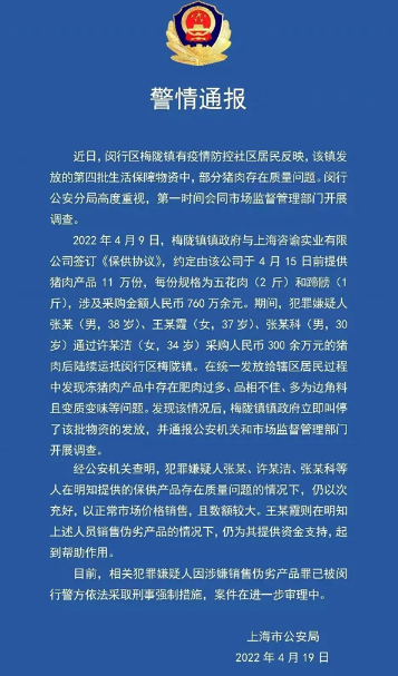 據(jù)上海市公安局通報(bào),4月9日,梅隴鎮(zhèn)鎮(zhèn)政府與上海咨諭實(shí)業(yè)有限公司簽訂《保供協(xié)議》,約定由該公司于4月15日前提供豬肉產(chǎn)品11萬(wàn)份,每份規(guī)格為五花肉(2斤)和蹄髈(1斤),涉及采購(gòu)金額人民幣760萬(wàn)余元。