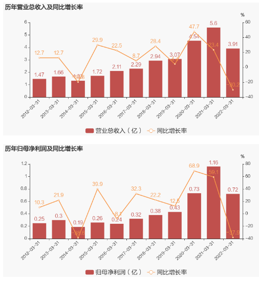 其中2022年第一季度,公司單季度主營收入3.91億元,同比下降30.2%;單季度歸母凈利潤7220.59萬元,同比下降37.94%;單季度扣非凈利潤5920.52萬元,同比下降39.01%;負(fù)債率22.36%,投資收益77.55萬元,財(cái)務(wù)費(fèi)用213.76萬元,毛利率49.4%。