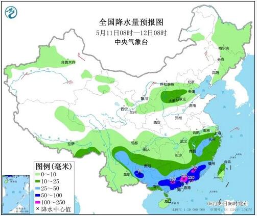 5月10日,降雨范圍將向東擴(kuò)展,雨勢更強,廣西、湖南、廣東、江西將普遍出現(xiàn)大到暴雨,局地大暴雨。