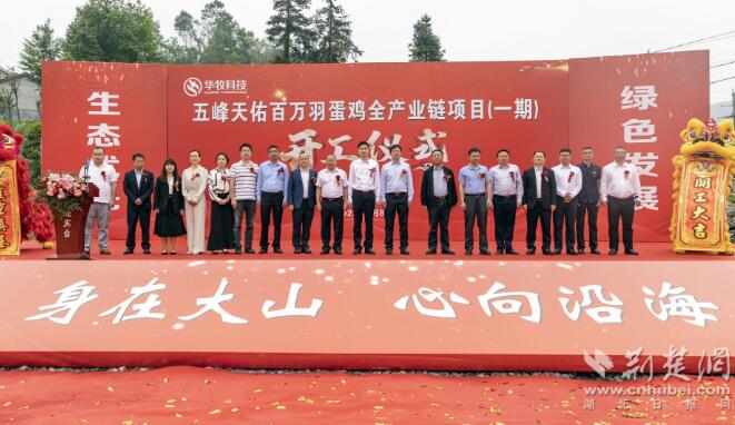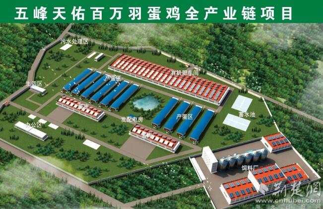 5月8日,五峰天佑百萬羽蛋雞全產(chǎn)業(yè)鏈項目開工活動在仁和坪鎮(zhèn)楊柳池村舉行。該項目計劃總投資5.2億元,一期規(guī)劃新建100萬羽生態(tài)蛋雞養(yǎng)殖場、10萬噸級生物有機肥廠、30萬噸飼料加工廠。