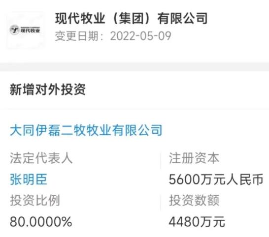 據(jù)企查查顯示,近日,現(xiàn)代牧業(yè)(集團(tuán))有限公司(以下簡稱“現(xiàn)代牧業(yè)”)成為了大同伊磊二牧牧業(yè)有限公司大股東,持股比例80%,投資額數(shù)4480萬元。