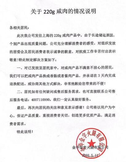 5月11日,一份來自金華金字火腿有限公司(下稱金華金字火腿)的“關(guān)于220g咸肉的情況說明”在網(wǎng)上流傳開來。該情況說明顯示,此次金華金字火腿發(fā)往上海的220g咸肉產(chǎn)品中,由于長途儲運原因,個別產(chǎn)品出現(xiàn)質(zhì)量問題,公司對此表示歉意。金華金字火腿給出的解決方案是:對于已發(fā)放至居民家中,對咸肉產(chǎn)品不滿意不放心的居民,公司可以把咸肉產(chǎn)品換成香腸或者醬肉產(chǎn)品,并承諾在3天內(nèi)完成退換配送。