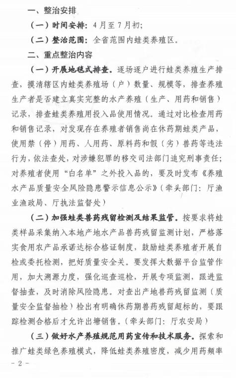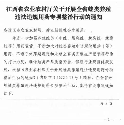 近期,江西省農(nóng)業(yè)農(nóng)村廳發(fā)布《關(guān)于開展全省蛙類養(yǎng)殖違法違規(guī)用藥專項(xiàng)整治行動(dòng)的通知》。