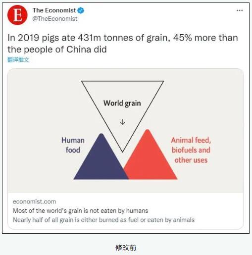 面對(duì)眾怒,《經(jīng)濟(jì)學(xué)人》6月29日修改了文章,同時(shí)在文章末尾做出“澄清”?!斑@篇文章的早期版本將豬的糧食消費(fèi)量與中國(guó)人的糧食消費(fèi)量進(jìn)行了比較。我們選擇中國(guó)僅僅是因?yàn)橹袊?guó)是世界上小麥和大米的主要消費(fèi)國(guó)?!?br>