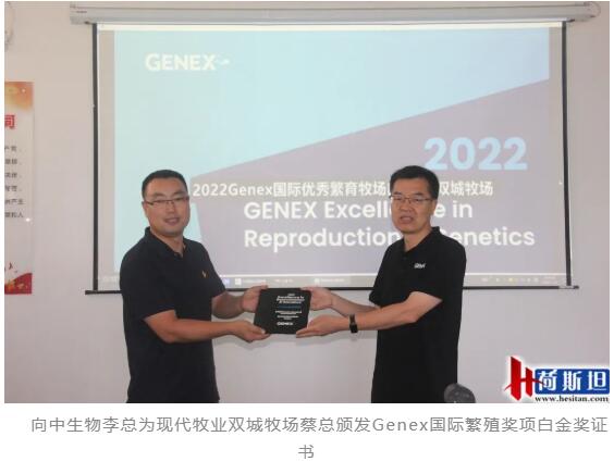 2020年向中生物推薦現(xiàn)代牧業(yè)通遼牧場(chǎng)參加評(píng)比,獲得成母牛組金獎(jiǎng)和青年牛組白金獎(jiǎng)。2021年,Genex國(guó)際繁殖獎(jiǎng)項(xiàng)把成母牛和青年牛綜合考慮,不再分開評(píng)獎(jiǎng),現(xiàn)代牧業(yè)雙城牧場(chǎng)獲得白金獎(jiǎng)。