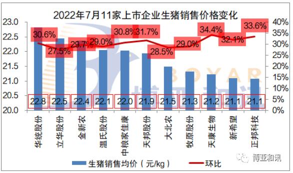 生豬銷售均價中,正邦科技為剔除仔豬影響后的價格,金新農(nóng)、天邦股份、天康生物為剔除仔豬、種豬影響后的價格,溫氏股份為毛豬銷售價格統(tǒng)計,立華股份為肉豬銷售價格統(tǒng)計,大北農(nóng)、新希望則為商品豬價格統(tǒng)計。7月份全國生豬月均價大幅上漲,上市企業(yè)月度銷售均價漲至21.7元/kg左右,較6月份上漲5元/kg左右。