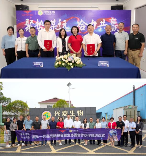 溫氏股份董事兼溫氏投資總裁趙亮(前排左一)、興嘉生物董事長黃逸強(前排右一)代表雙方簽署合作協(xié)議