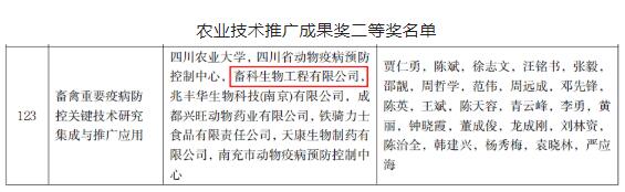 畜科生物工程有限公司聯(lián)合四川農(nóng)業(yè)大學、四川省動物疫病預(yù)防控制中心以及鐵騎力士等單位共同申報的關(guān)于《畜禽重要疫病防控關(guān)鍵技術(shù)研究集成與推廣應(yīng)用》項目,獲得了《2019-2021年度全國農(nóng)牧漁業(yè)豐收獎》農(nóng)業(yè)農(nóng)村部授予的農(nóng)業(yè)技術(shù)推廣成果二等獎。