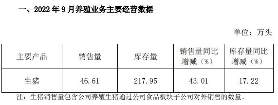 2022年9月,公司生豬銷售量46.61萬頭,銷售量環(huán)比減少3.64%,同比增長43.01%。