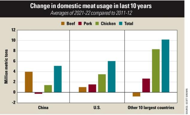 美國和中國牛肉、豬肉和雞肉消費的總增長超過了其他10個最大國家市場的總和。