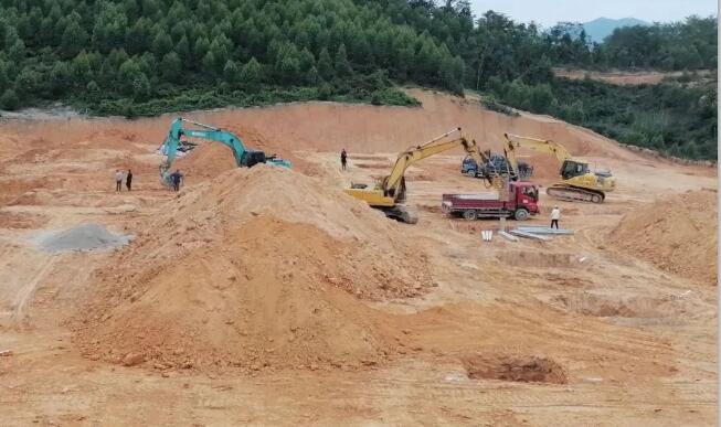 在工地現(xiàn)場(chǎng),推土機(jī)、鉤機(jī)、工程車等在各個(gè)點(diǎn)位來回穿梭,有多個(gè)山頭已經(jīng)被削平,有的點(diǎn)位已經(jīng)開始建設(shè)地面建筑。