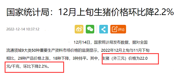 據(jù)對(duì)全國(guó)流通領(lǐng)域9大類50種重要生產(chǎn)資料市場(chǎng)價(jià)格的監(jiān)測(cè)顯示,2022年12月上旬與11月下旬相比,29種產(chǎn)品價(jià)格上漲,18種下降,3種持平。其中,生豬(外三元)價(jià)格為22.0元/千克,環(huán)比下降2.2%。