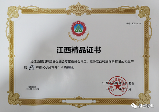 品牌價值是企業(yè)的無形資產(chǎn)??露黠暳弦再|量穩(wěn)定著稱市場,截止目前,已有4件江西省名牌產(chǎn)品。集團經(jīng)典產(chǎn)品——膨化小豬料,更是好評如潮,深受養(yǎng)豬戶的喜愛并得到廣大養(yǎng)豬同行的高度認可,被認定為首屆“江西精品”(2022年度,全省只有20件產(chǎn)品獲此殊榮),入選《2022年度贛州市名優(yōu)創(chuàng)新產(chǎn)品推薦目錄(第一批)》。