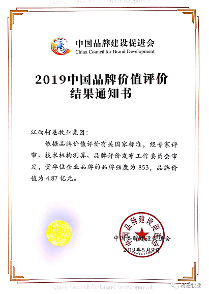 2019年5月9日,2019中國品牌價值評價信息發(fā)布活動在上海舉辦,柯恩品牌被中國品牌建設促進會認定品牌價值為4.87億元。