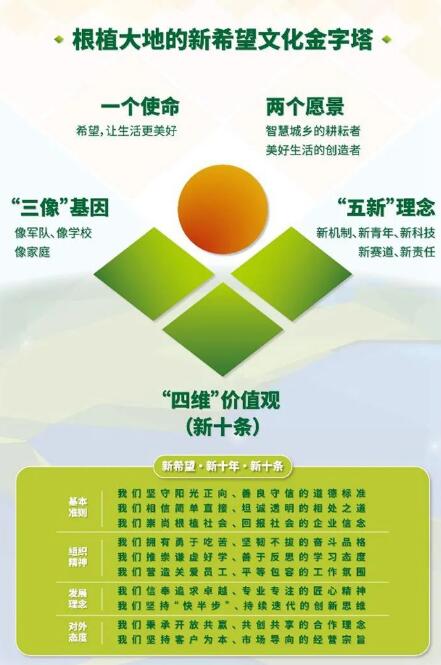 2019年,我們又提出了新希望企業(yè)文化金字塔,以及“五新”管理理念,也就是“轉(zhuǎn)換新機(jī)制、任用新青年、探索新科技、布局新賽道、擔(dān)當(dāng)新責(zé)任”,堅(jiān)定了新的十年戰(zhàn)略方向。