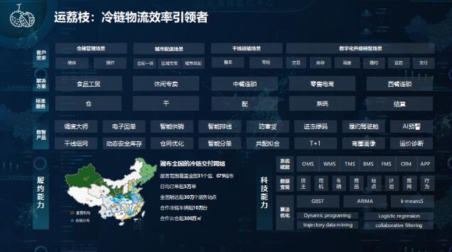 在物流配送上,有全國(guó)領(lǐng)先的鮮生活冷鏈物流,通過(guò)一款“運(yùn)荔枝”軟件,制定一體化的供應(yīng)鏈交付解決方案。“運(yùn)荔枝”提供的服務(wù),包括了運(yùn)力推薦、電子回單、定存管理、智能排線、AI預(yù)警、倉(cāng)孿生、倉(cāng)網(wǎng)優(yōu)化、食安溯源、然后商圈畫(huà)像等等。