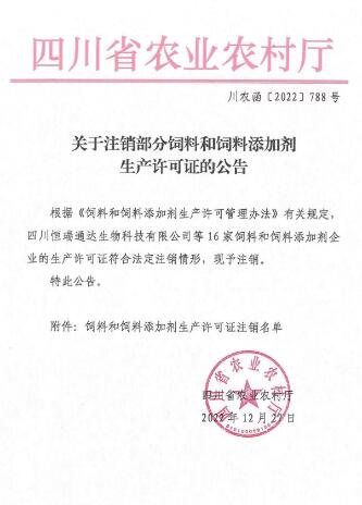 2022年12月27日,四川省農(nóng)業(yè)農(nóng)村廳發(fā)布公告,注銷四川恒瑞通達(dá)生物科技有限公司等16家飼料和飼料添加劑企業(yè)的生產(chǎn)許可證。