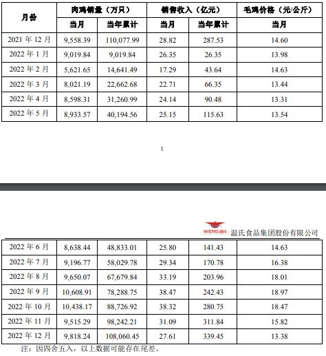 1、溫氏食品集團(tuán)股份有限公司(以下簡稱“公司”)2022年12月銷售肉雞9,818.24萬只(含毛雞、鮮品和熟食),收入27.61億元,毛雞銷售均價(jià)13.38元/公斤,環(huán)比變動(dòng)分別為3.18%、-11.19%、-15.42%,同比變動(dòng)分別為2.72%、-4.20%、-8.36%。