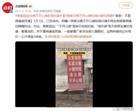1月3日下午,極目新聞記者撥通了該商戶電話。他稱,淘汰豬售價3元每斤,是活豬,“不開心豬”則是生病的豬,在處理廠處理了,是死亡了的。該商戶稱不知道“不開心豬”生了什么病。