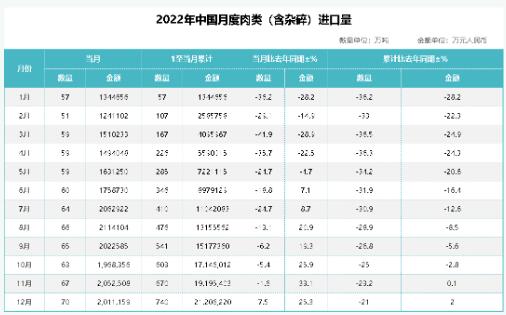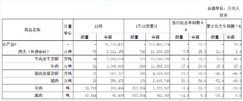 近日,海關(guān)總署發(fā)布最新進出口肉類產(chǎn)品統(tǒng)計信息。數(shù)據(jù)顯示,12月我國進口肉類(含雜碎)70萬噸,同比增長7.5%,同比增長25.3%。