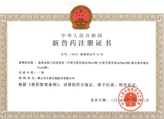 在這樣的背景下,2003年正典生物啟動了雞球蟲病疫苗的研制,歷經(jīng)5年攻堅克難,正典球苗®-4(雞球蟲病四價活疫苗)2007年獲得國家新獸藥證書,2008年正典生物建成亞洲首家寄生蟲疫苗車間并獲得農(nóng)業(yè)部批準(zhǔn)文號成功上市。