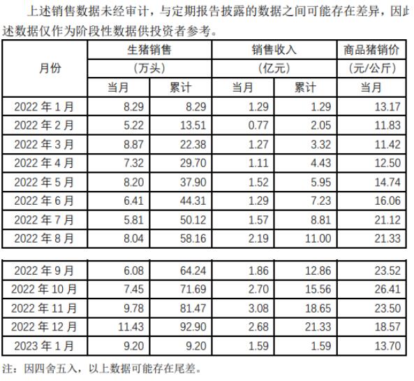 2023年1月份,公司銷售生豬9.20萬(wàn)頭(其中商品豬銷售9.06萬(wàn)頭),銷售收入1.59億元。其中向集團(tuán)內(nèi)部屠宰企業(yè)銷售生豬1.61萬(wàn)頭。