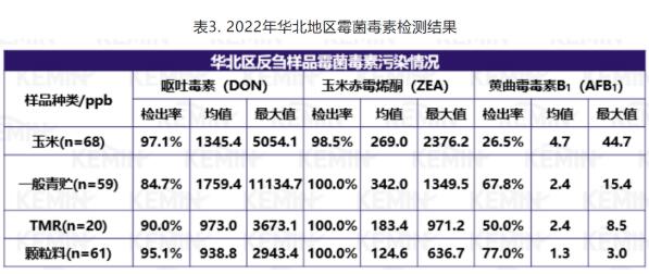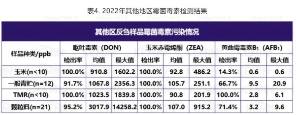 玉米赤霉烯酮的污染集中在一般青貯和TMR中,這一點各個地區(qū)具有一定共通性,需要注意的是,一般青貯樣品既是反芻生產(chǎn)重要的原料,也是多種霉菌毒素的污染載體,這一點也反映在采用青貯類原料的TMR樣品中霉菌毒素污染的組成與一般青貯中的污染組成存在一定的相似性中,建議生產(chǎn)過程需要重點關(guān)注一般青貯類原料的霉菌毒素污染水平。