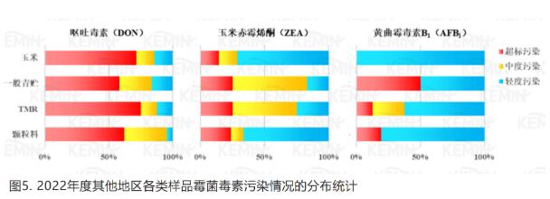 2022年建明CLS收到華南地區(qū)樣品10份、華中地區(qū)樣品18份、東北地區(qū)樣品47份、西北地區(qū)樣品1份,合計樣品占總樣品數(shù)10.6%,因此合并以上地區(qū)樣品進(jìn)行統(tǒng)計分析,對該區(qū)各類原料及飼料中各種霉菌毒素檢測結(jié)果見表4、圖5。