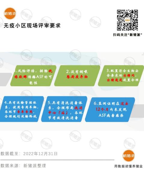 無疫小區(qū)更加有利于畜禽跨區(qū)流動,減少疫病傳播風(fēng)險(xiǎn),同時為未來參與國際貿(mào)易打下基礎(chǔ)。農(nóng)業(yè)農(nóng)村部也進(jìn)一步完善落實(shí)了非瘟無疫小區(qū)的推進(jìn)標(biāo)準(zhǔn)以及相關(guān)政策。明確各級主體的職責(zé)與分工。確定了評估步驟以及相關(guān)標(biāo)準(zhǔn)。