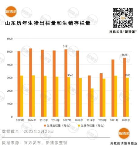 非洲豬瘟對山東養(yǎng)豬業(yè)的影響深遠。數(shù)據(jù)顯示,非瘟前山東生豬年出欄量超過5000萬頭,2019年大幅下滑至3176萬頭。2022年,山東出欄生豬4528萬頭,同比增長2.9%,僅為2017年的87%。