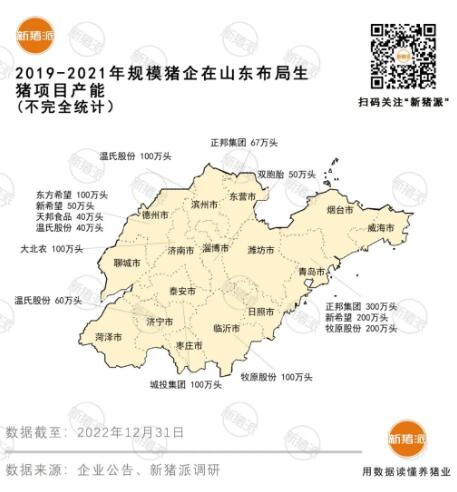 值得注意的是,非瘟后,在政策等刺激下,山東省的其他地市同樣吸引了不少豬企“落子養(yǎng)豬”,而閑置土地資源較為豐富的東營、濱州、青島更是受到青睞。據(jù)新豬派不完全統(tǒng)計,2019-2021年,溫氏、正邦、新希望等豬企合計在山東布局生豬項目產(chǎn)能超過1500萬頭。