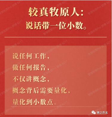 這讓我想起來在網(wǎng)上看到的一張圖片,“較真牧原人,說話帶一位小數(shù)?!边@句話讓我感觸很深。我第一份工作養(yǎng)成的習(xí)慣就是,每個指標(biāo)都要到小數(shù)點。