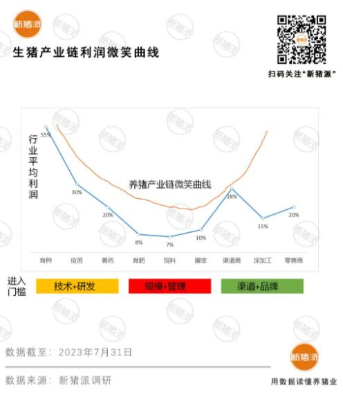 根據(jù)統(tǒng)計(jì)測(cè)算,生豬產(chǎn)業(yè)鏈行業(yè)平均利潤最高的是育種,高達(dá)55%;屬于產(chǎn)業(yè)鏈利潤微笑曲線的頂端。做好育種則需要技術(shù)與長期研發(fā)經(jīng)費(fèi)的支撐,可不是一蹴而就。