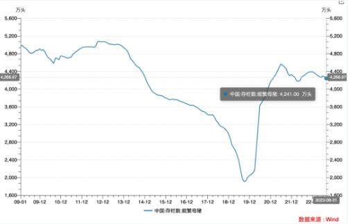 農(nóng)業(yè)農(nóng)村部設(shè)定全國能繁母豬正常保有量約為 4100 萬頭。本輪豬周期中,母豬存欄量始終未低于這一水平,截至7月末,能繁母豬存欄約4271萬頭。這意味著,2023年生豬供應(yīng)仍將保持充足。