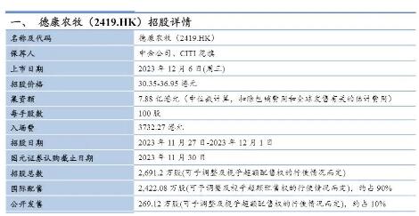 11月27日,德康農(nóng)牧(02419.HK)發(fā)布招股公告,預(yù)期將于2023年12月6日于聯(lián)交所主板掛牌上市。公司在中國所有生豬供應(yīng)商中排名第六,市場份額為0.8%。在所有黃羽肉雞供應(yīng)商中排名第三,市場份額為2.1%。
