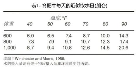 水是最容易被忽視的同時(shí)也最重要的營(yíng)養(yǎng)物質(zhì)。育肥牛所需的水量是有關(guān)它們干物質(zhì)攝入量和環(huán)境溫度的函數(shù)(表1)。提供足夠的清潔水不僅對(duì)犢牛的健康至關(guān)重要,也對(duì)肉牛的生產(chǎn)性能至關(guān)重要。