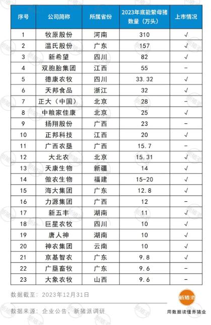 2023年能繁母豬TOP20豬企