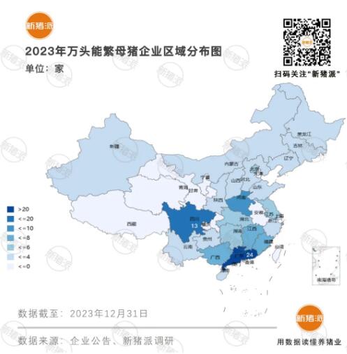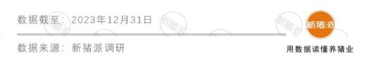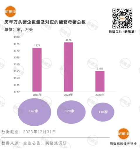 根據(jù)新豬派統(tǒng)計,截至2023年底,全國擁有1萬頭以上能繁母豬的企業(yè)共計118家,較2022年底減少2家。企業(yè)數(shù)量減少的同時,萬頭豬企能繁母豬共計1155萬頭,亦較2022年底的1176萬頭下降2%,占全國總量的28%。