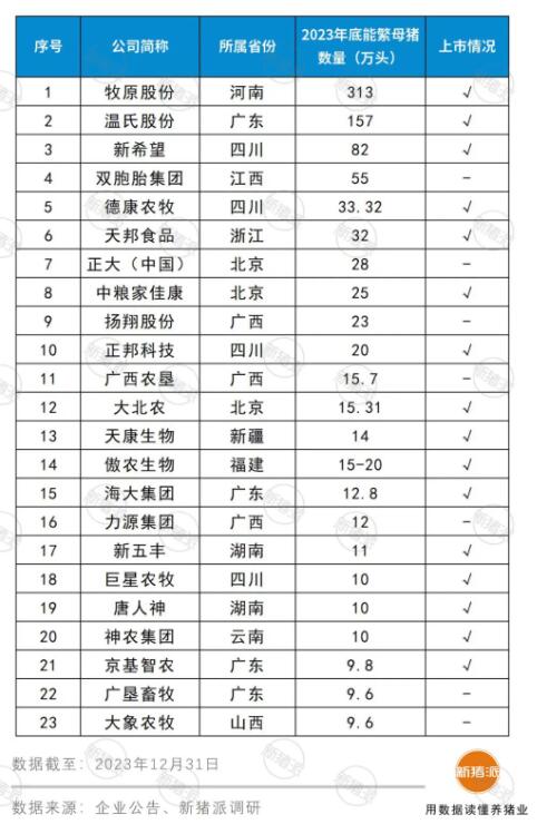 頭部豬企中牧原、溫氏資金儲備相對充裕,養(yǎng)豬成本控制亦處于行業(yè)領(lǐng)先水平,兩家企業(yè)2023年能繁母豬數(shù)量增長都在10%以上,分別以313萬頭、157萬頭創(chuàng)下歷史新高。