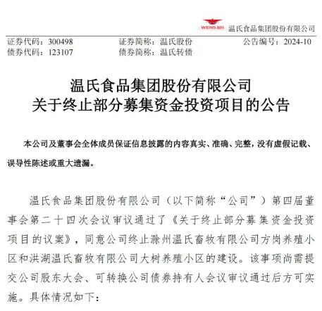 溫氏股份稱,公司擬終止洪湖溫氏畜牧有限公司大樹養(yǎng)殖小區(qū)的建設(shè),主要是受市場環(huán)境變化影響,公司調(diào)整了湖北區(qū)域生產(chǎn)計(jì)劃,現(xiàn)有資源已能基本滿足當(dāng)?shù)匦枨?;且該?xiàng)目地勢低洼,雨季易內(nèi)澇,預(yù)計(jì)繼續(xù)建設(shè)將存在較大的生物安全和環(huán)保風(fēng)險(xiǎn)。