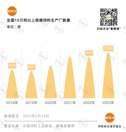 作為養(yǎng)殖業(yè)的上游行業(yè),飼料行業(yè)內(nèi)卷早已是不爭(zhēng)的事實(shí),在養(yǎng)殖業(yè)的規(guī)?;⑿星榈兔缘纫蛩赜绊懴?,卷價(jià)格、卷質(zhì)量、卷價(jià)值服務(wù)。而隨著大型飼料企業(yè)的崛起,競(jìng)爭(zhēng)優(yōu)勢(shì)不足、經(jīng)營(yíng)不善的中小飼企整合重組或退出市場(chǎng),飼料行業(yè)集中度逐步提高。 2023年,全國(guó)10萬(wàn)噸以上規(guī)模飼料生產(chǎn)廠增至1050家,同比增加103家;合計(jì)飼料產(chǎn)量1.96億噸,占全國(guó)總量的61%,占比同比提高了3.5個(gè)百分點(diǎn)。