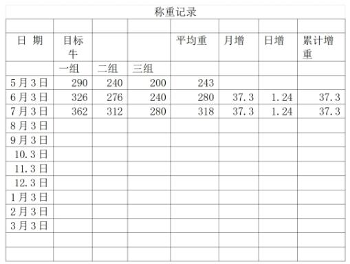 每月1次稱重記錄,求平均值,填表、描圖,記錄表、體重變化圖,根據(jù)牛場情況繪制增重曲線。