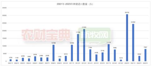 實(shí)際上,非瘟后我國(guó)從國(guó)外進(jìn)口種豬數(shù)量并不少,但引種回來(lái)后是否真的在育種,又能否維持種豬健康狀況,是對(duì)企業(yè)人才團(tuán)隊(duì)、資金實(shí)力等多方面的考驗(yàn)。據(jù)《農(nóng)財(cái)寶典》新牧網(wǎng)記者統(tǒng)計(jì),2018年我國(guó)暴發(fā)非瘟后,次年種豬進(jìn)口量驟降。2020-2021年是種豬進(jìn)口的井噴期,兩年進(jìn)口5萬(wàn)多頭,遠(yuǎn)高于常年需求。2023年國(guó)內(nèi)引種進(jìn)口種豬7997頭。